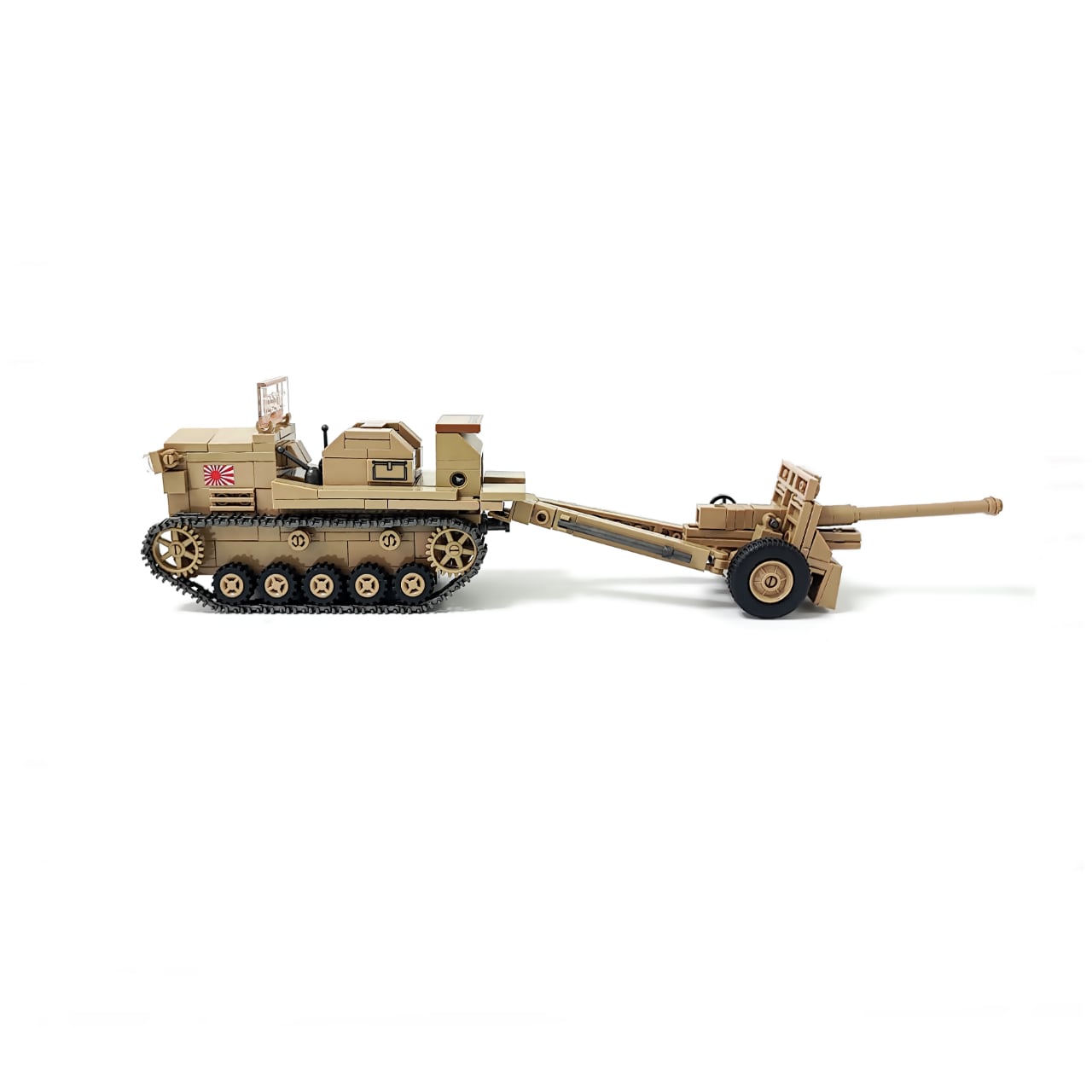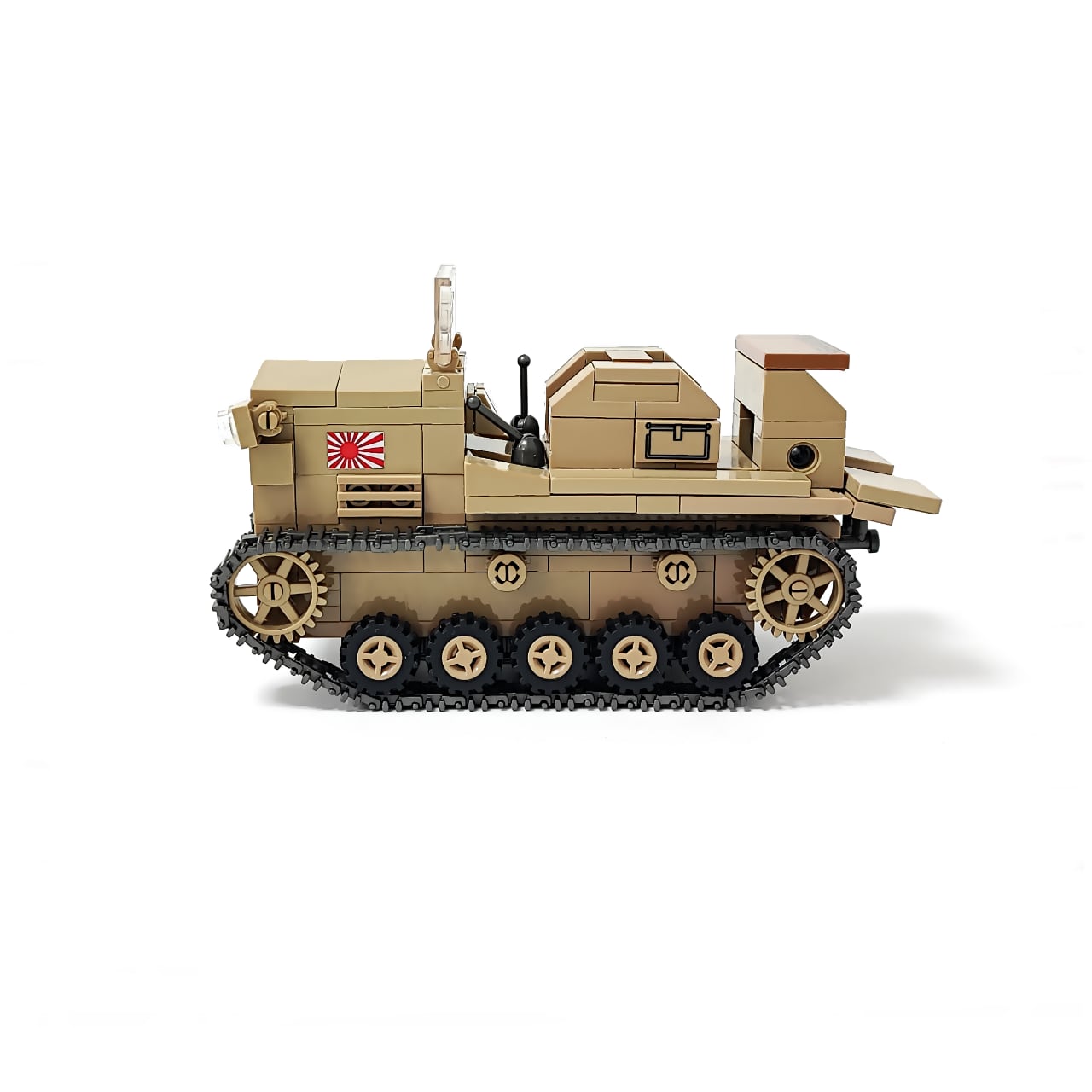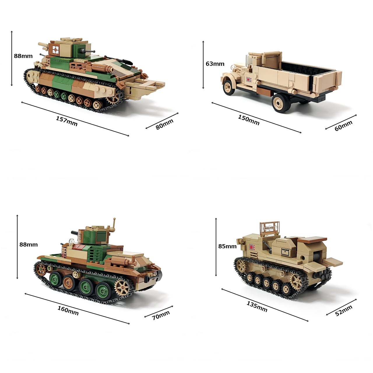 八九式中戦車、528PCS、九二式重装甲車、403PCS、九八式四屯牽引車シケ、462PCS、日産180トラック、278PCSのブロックを組み立てると、写真のようなブロック戦車が完成します。